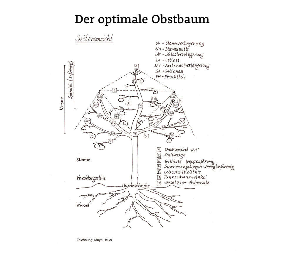 Durch das entwickelte Regelsystem können wir Jungbäume systematisch so erziehen, dass der Baum einen harmonischen Kronenaufbau erhält und vier starke Leitäste aufweist. So kann er von vier Seiten problemlos, durch die dadurch entstehenden Anstellflächen, mit der Leiter bearbeitet werden und durch guten Licht- und Lufteinfall dauerhaft qualitativ hochwertigstes Obst ohne Stützen tragen. Weiterhin gewährleistet das Anlegen von Trittästen an der Stammverlängerung, ein problemloses Klettern im Baum bis in die Krone. Dabei arbeiten wir stets naturgemäß, mit den natürlichen Wuchsgesetzen des Baumes, und können so das (Richtungs-)Wachstum kontrolliert beeinflussen und davon profitieren. Das Motto ist hierbei, mit möglichst wenig Aufwand viel zu erreichen. Einige, wenig aufwendige Handgriffe in Schnitt und Ernte, erzielen dauerhaft hohe Fruchtqualität bei guter Baumgesundheit. Besonders für den Hochstammobstbau ist die Schnitttechnik besonders wichtig, da Hochstammbäume weit über 100 Jahre alt werden können und so durch ein stabiles Astgerüst dauerhaft profitieren.